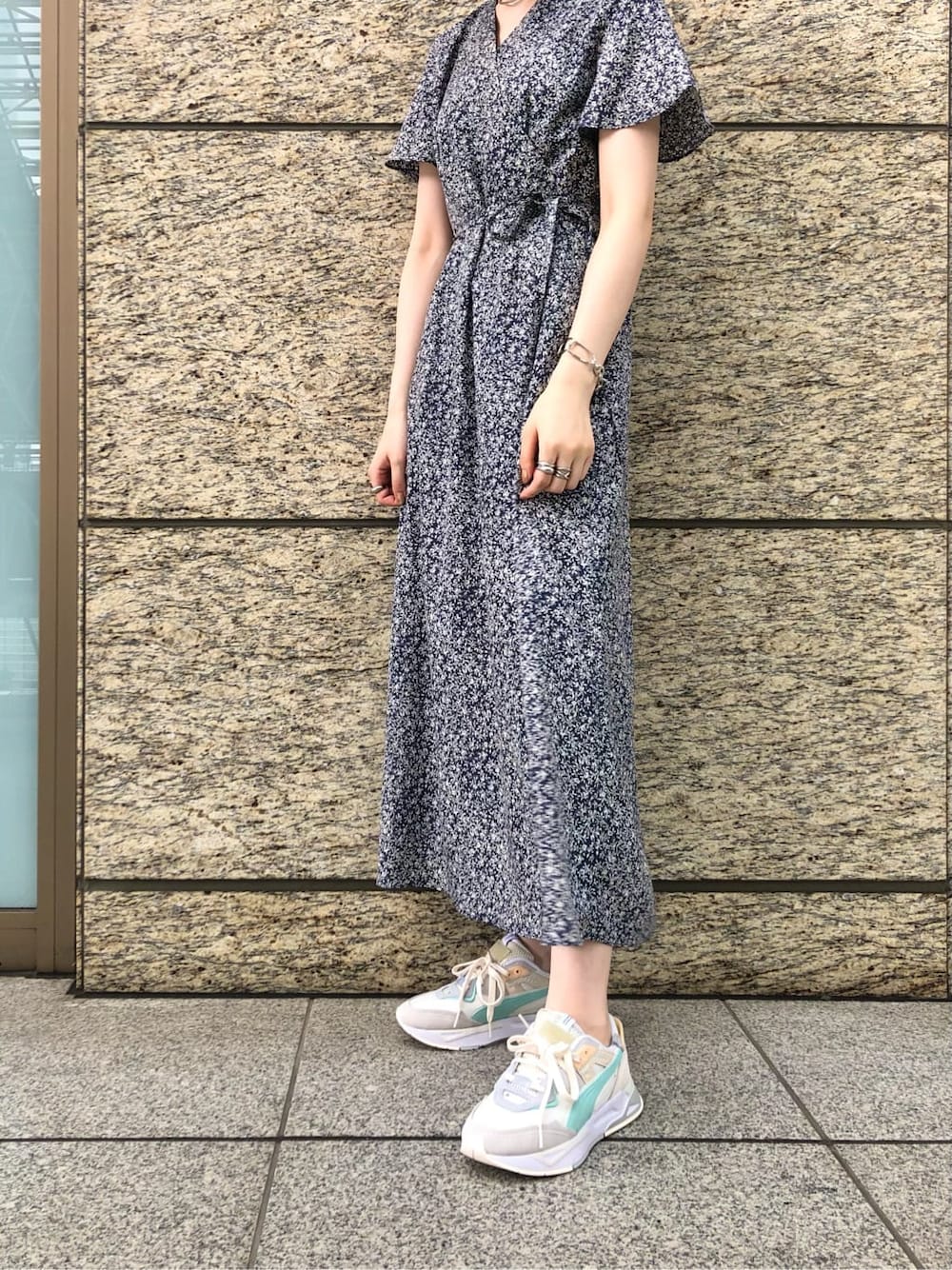 高めの位置のウエストリボンでスタイルアップの叶うワンピース。 フェミニンな印象の小花柄でも大人っぽく上品に着れるブルーをチョイス ◯ 開きすぎないVネックと揺れるシルエットで女性らしい印象に仕上げてくれます。 今年らしくキレイめワンピースをボリューム感のあるスニーカーと合わせるのもオススメ! 合わせる靴やアクセサリーによって普段使いしやすいカジュアルなスタイルにもキレイめにも幅広いシーンで活躍間違いなしですね! 夏場の冷房対策としてワンピースのバランスを崩さないショート丈のカーディガン、肌寒い季節にはトレンチコートなどを合わせて長く大切に着ていただきたいワンピースです!