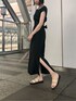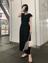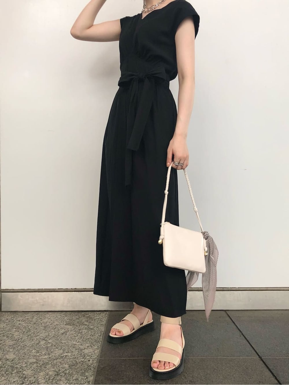 チェック柄と無地の3色展開ワンピース。 女性らしさも残しつつキリッとした印象に見える、着回し力抜群のブラックをチョイスしました! ウエストの切替位置も高く、ベルト幅も広く作られているのでスタイルアップ効果抜群◎ ブラックは綿素材ではなく、秋らしいフィブリル感のある生地です。 上品な素材感なのでパンプス合わせでキレイめなシーンでも使っていただきたいワンピース。 片側に入ったスリットからのさり気ない肌見せが女性らしく魅力的なポイント ◎ 夏に着るブラックは重くなりすぎないように靴と小物は白で合わせました! 厚みがあるこちらのサンダルはスニーカーのような楽な履き心地です! 足首にベルトがあるので靴擦れも無く、歩きやすく安定感のあるサンダルです。