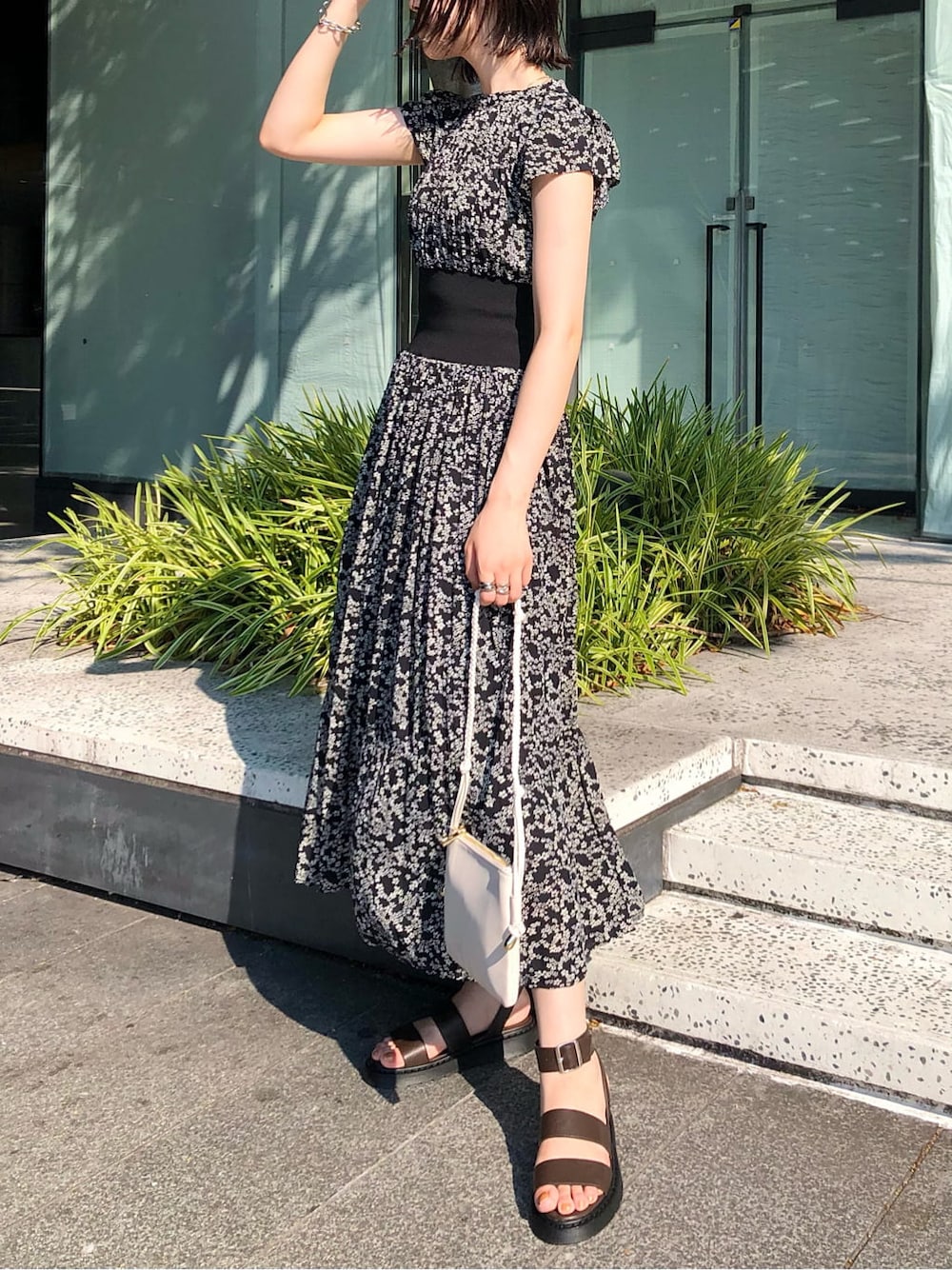 ウエストをリブで切り替えたトレンド感満載ワンピース◯ 少し高めの位置にリブの切り替えが施されているのでウエストもスッキリ見え、嬉しい脚長効果と女性らしいくびれシルエットの叶うワンピースです。 スカート部分は細かいプリーツデザインになっているので広がりすぎず小花柄でも大人な印象で着ていただけます。 私は今年らしくキレイめなワンピースにボリューム感のあるサンダルを合わせて大人カジュアルに着てみました。 マキシ丈のワンピースなので秋にはロング丈のトレンチコートやショート丈のライダース、Gジャンを羽織って足元にショートブーツを合わせてロングシーズン着ていただきたいワンピースです!