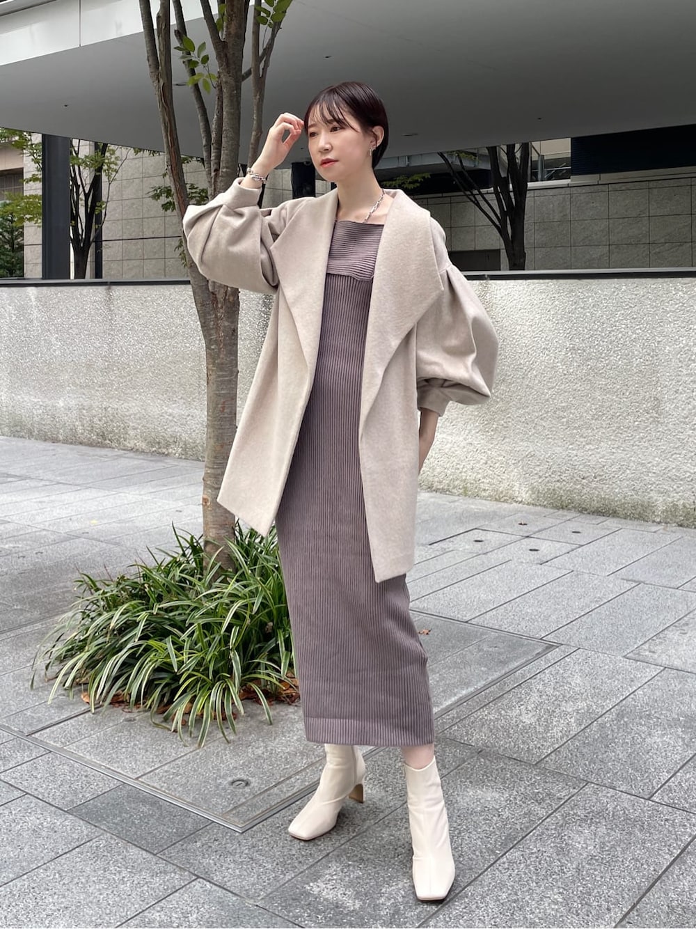 【OUTER】ボリュームコートの着られてる感が苦手な方にもオススメなコート!ベルトでウエストを絞りウエスト位置を持ち上げて着ていただけるので着られている感が無く小柄な方にも好評です!! お尻まですっぽりと隠れる丈感なのでアウターを選びがちなワイドパンツやマーメイドスカートにもぴったり! 【ONE PIECE】アシンメトリーが程よくデコルテを出したデートにもぴったりな女性らしいワンピース。 タイトなデザインなので骨盤がしっかりとしている私はMサイズで着用しています。 ラインも強調しすぎず168cmでも長すぎずブーツスタイルにもぴったりな丈感でした! 【SHOES】ヒールが苦手な方にも好評のスクエアブーツ。24.5cmでMサイズでも足先が潰れる心配もなく厚手の靴下を履いていても問題なく履けました!