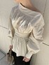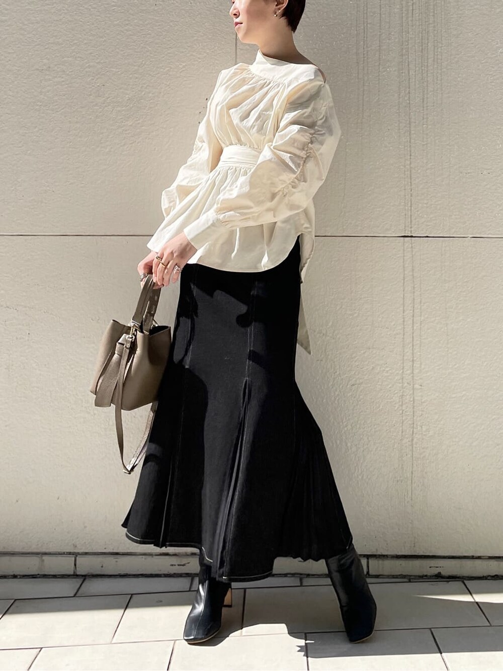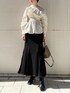 【TOPS】肌見せが女性らしいブラウス。たっぷりのギャザーでボリュームをもたせている事で二の腕や胸元もカバーしつつ、ウエストや手首はキュッとしているのでスタイルアップ効果抜群です!ウエストの後ろがゴムなので着心地も楽でした! 【SKIRT】LAGUNAMOONのマーメイドスカートは裾の切替位置が高くお尻のラインも拾いにくいので腰周りのボリューム感を気にされている方にもオススメです!甘くなりすぎず大人っぽく着ていただけるデザインです!裾にプリーツデザインが入っているのでマーメイドスカートとは思えない程歩きやすいのでお気に入りです!