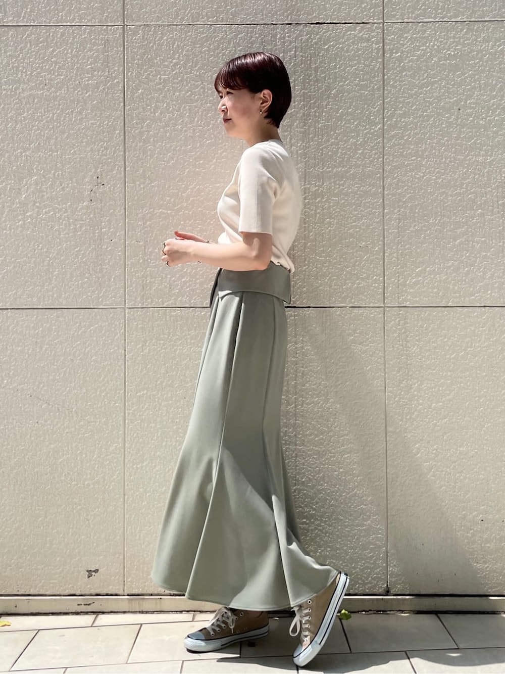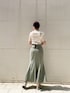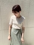 【TOPS】肌に触れるとひんやり気持ちいい接触冷感のニット。お家で洗濯できさらっと着れるのでジメジメした時期に大活躍します。Tシャツほどカジュアルにもなりすぎないので綺麗めなスカートやパンツとのスタイリングもオススメです! 【SKIRT】ハイウエストで腰の位置でしっかり止まるのでの168cmでMサイズでぴったり着れました。手触りの柔らかいさらっとした素材でシワにもなりにくいのでロングシーズン着れるのが嬉しい。