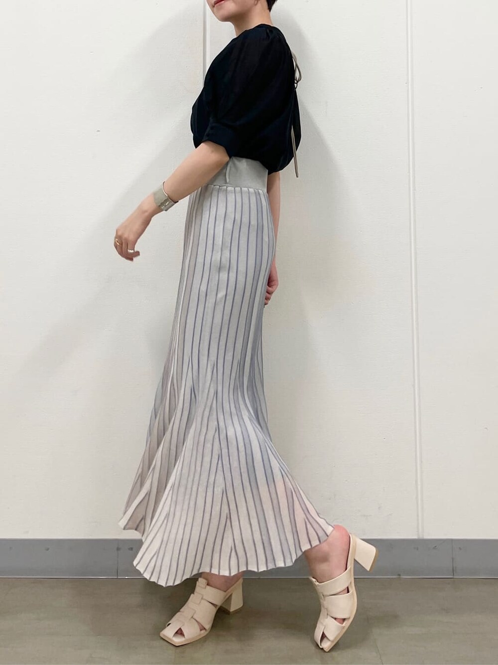 ●梅雨時期に着たいさっぱりとした素材感のコーデ【TOPS】梅雨時期にもぴったりのベタつきにくいシアー素材のブラウスでノンストレスで着れました!後ろにリボンがポイントのデザインですが、前後逆でアレンジした着方もおすすめです。 【SKIRT】サラッとした素材感で風通し抜群のスカート。168cmでMサイズで踝下なのでTシャツスニーカーのラフなスタイルでもおしゃれ見え間違いなしです!