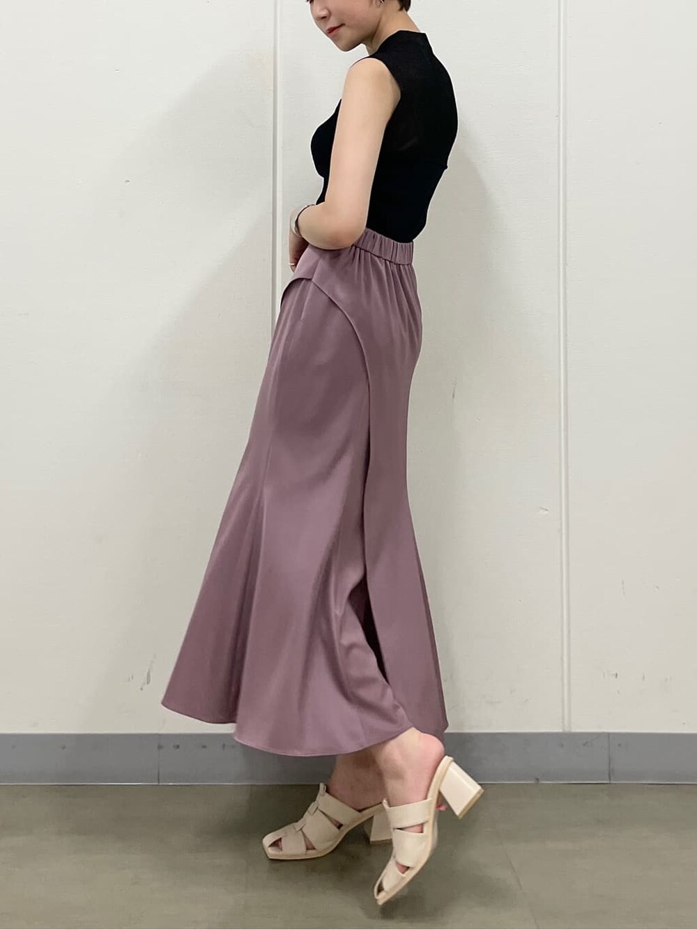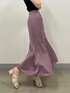 ●サテンスカートが主役のキレイめコーディネート【SKIRT】腰から斜めに入ったカッティングがカバーになり驚く程腰周りをすっきりと見せてくれます。店頭では着るとびっくりされる方が続出してます!テロっとした素材感でニットやTシャツでカジュアルに着ても可愛いです。【TOPS】ラメ入の糸が日光の下でキラッと光る透け感ニット。透けすぎないのでブラックでも上品でデニムやシンプルなスカートもお出掛けコーディネートにランクアップしますよ!