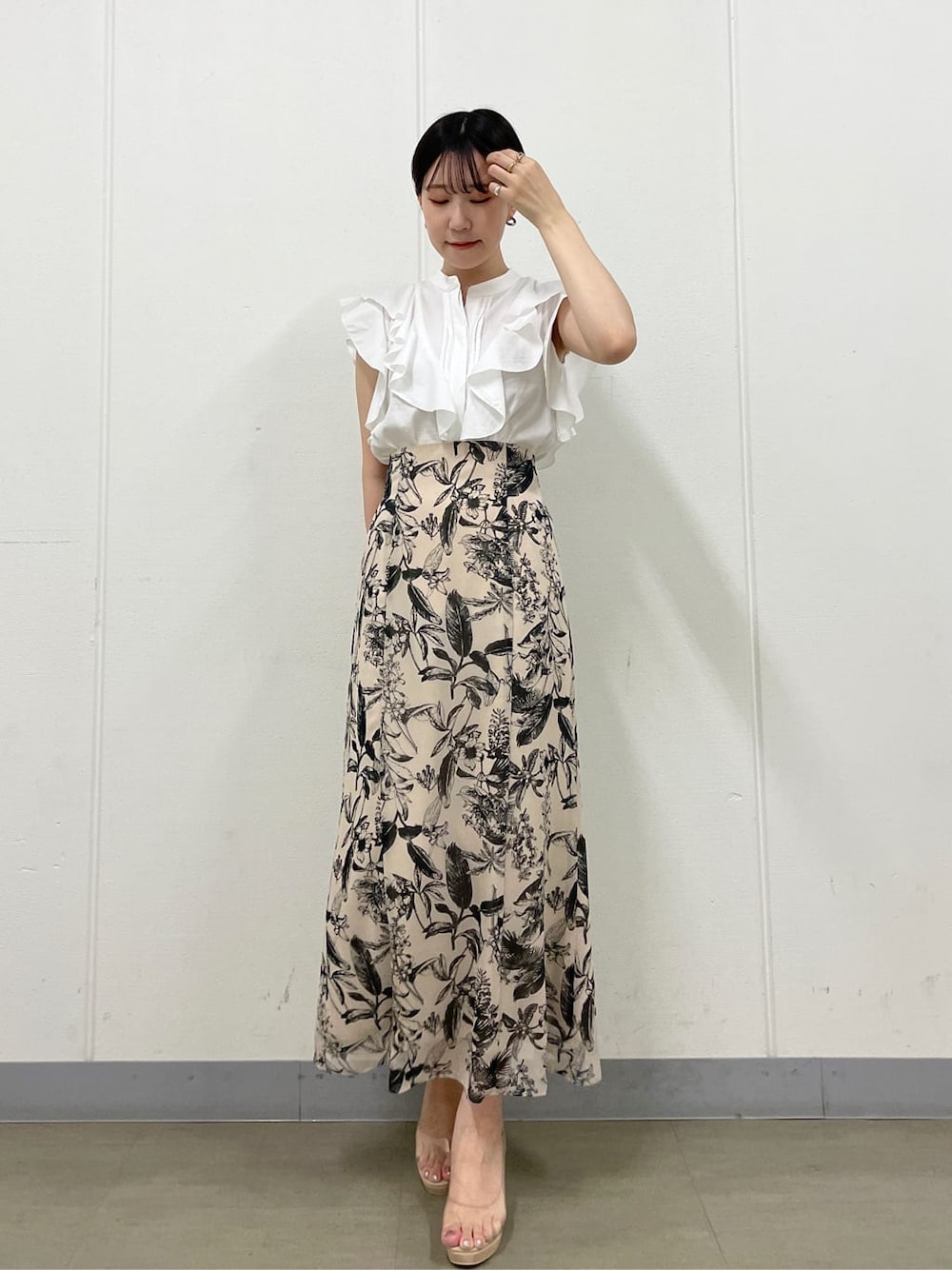 ●人気ブラウスの着回し!休日のお出掛けやデートイメージしたキレイめコーデ! 【TOPS】ノーカラーで程よく抜け感があるので普段フリルを着ないカジュアル好きの方にも好評のブラウス!フリルが二の腕にがっつりかかるので細見えするところが1番嬉しい! 【SKIRT】線書きのボタニカル柄が大人っぽくて素敵!ナチュラルなナローシルエットだからタイトやマーメイドが苦手な方にもおすすめです!大きめの柄が甘々にもならないから春夏はTシャツ×サンダル、秋冬にはざっくりニット×ショートブーツでも着たい!