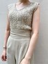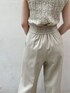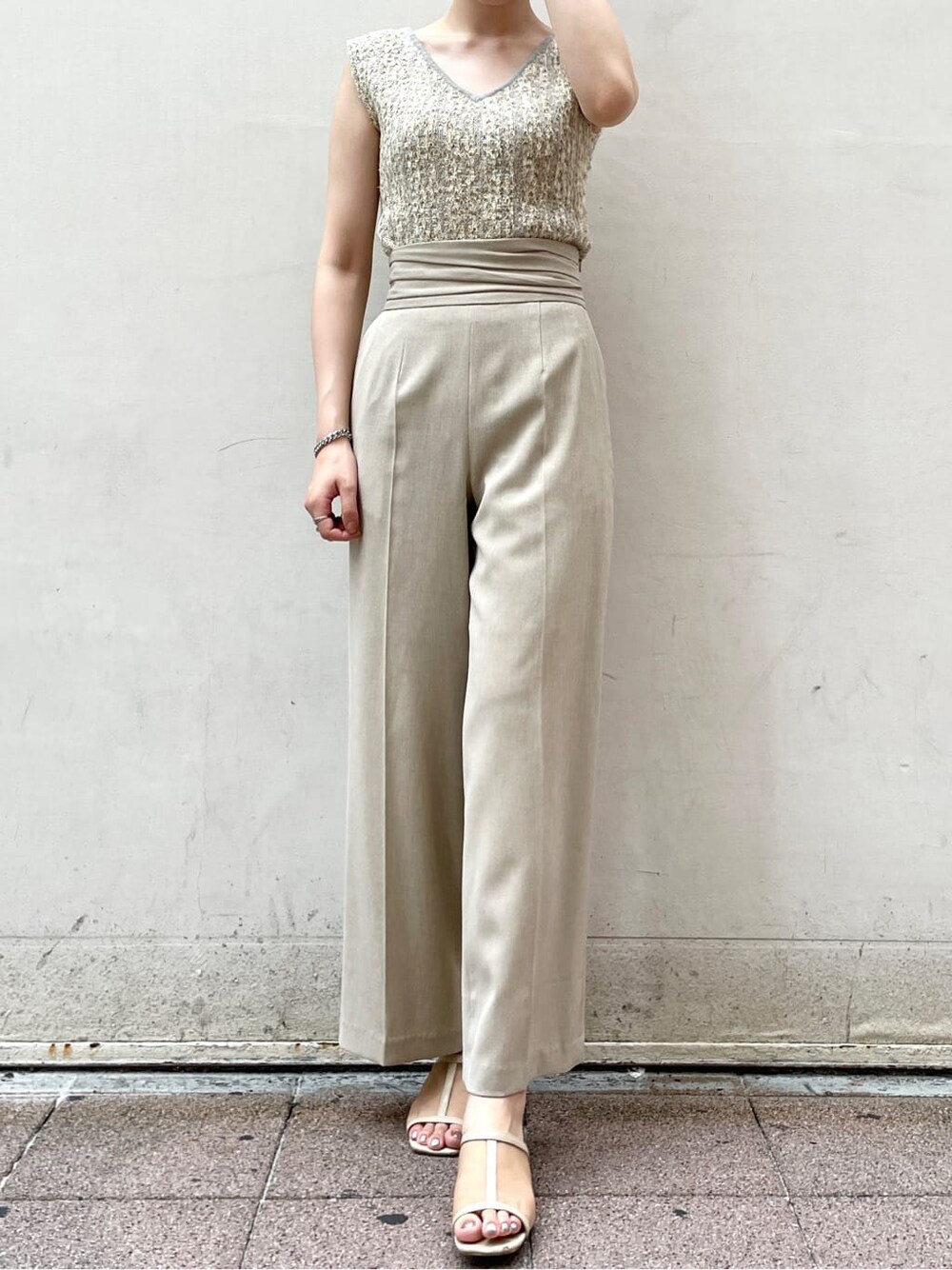 ●色味から涼しげなワントーンコーデ。【TOPS】大人が楽しめるツイードニットを肌馴染みのよいアイボリーで着てみました!VとUで前後2WAY仕様。肩幅しっかりめの骨格ナチュラルですが幅広に作られているので羽織なしでも二の腕がすっきり見えするから1枚でも安心して着れました◎ シンプルなカラーパンツやキレイめスカートとも相性抜群! 【PANTS】さらっとした素材のパンツなので通気性抜群で蒸し暑い時期にぴったり!ハイウエストでウエスト幅も広いのでお腹もすっきり見えます!