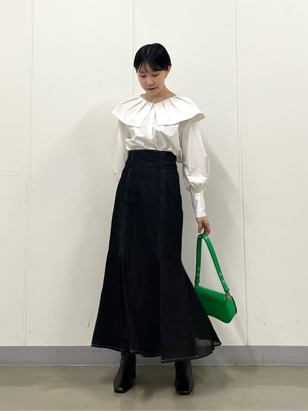 ●再入荷デニムマーメイドスカート着回し! 【TOPS】小顔に見せてくれるビックカラーが可愛くてチョイス!肩幅まで広がる襟が上半身のボリュームもカバーするので、シンプルデニムパンツ合わせも可愛いくなります! 【SKIRT】裏地が入っていないので真夏はTシャツ×サンダル、秋冬にはタートルネック×ブーツなどシーズンレスで着れちゃいます◯バックベルトでがっつり調節できるのでいつもウエストのサイズ感で困られる方にも好評です!