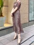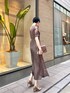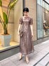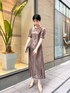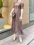 ●お呼ばれやお食事にも好印象見えするドレス♡【DRESS】下腹部の上の1番細い位置がウエストマークなので嫌な締め付け感ゼロで着ていただけるドレス♡ ややパープル感のあるモカが絶妙に可愛くて、肌馴染みが良く色白見えするから最高です◎サイドのリボンでウエストは調節できるので、幅広い体型の方にも着ていただけます。サンプルなのでSサイズ着用しましたが、高身長で丈長めが好きな方にはMサイズがオススメです! 【SHOES】ソールが足を優しく包め込むので長時間歩いても疲れにくく、24.5cmで普段ヒールを履かない私でもMサイズでぴったり!大粒すぎない上品な輝きのラメなので日常にも使いやすいパンプスです。