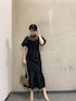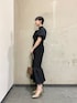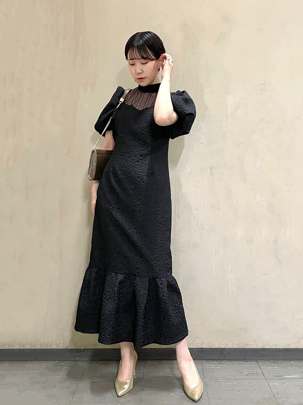 ●二次会・成人式におすすめのブラックドレス 🔍 【DRESS】凹凸のある生地で真っ黒のドレスも光沢感がプラスされて華やかになります 🤍レースの甘いデザインが苦手な方にもおすすめのドレスです!立体感のある素材で体のラインを出しすぎず着れるのでお食事後も安心です ☺✊🏻 【SHOES】ソールが足を優しく包め込むので長時間歩いても疲れにくく、24.5cmで普段ヒールを履かない私でもMサイズでぴったり履けました!上品な輝きのラメなので日常にも使いやすいシリーズ。BAGとカラーを揃えて使っていただくのがおすすめです!