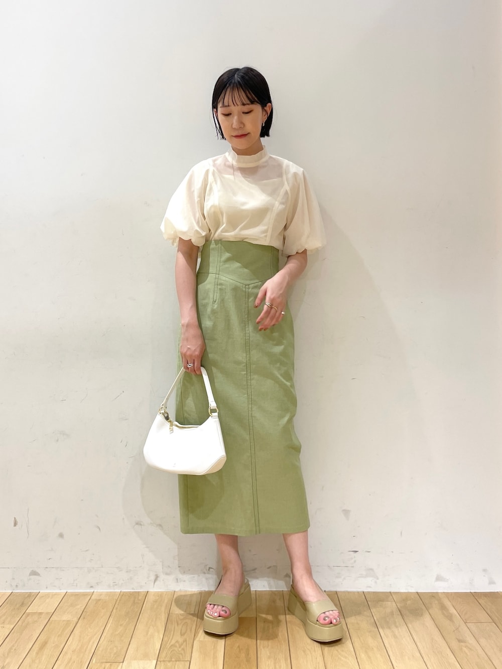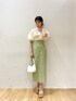 ●春夏着たくなるグリーンコーデ 🌱 【Tops】梅雨時期にもぴったりのベタつきにくいブラウス👏🏻やや透け感もあるシアー素材なので涼しく着れました🍃 肩の内側から袖が出ているので肩幅が広く見えることもないです😌 【Skirt】168cmでMサイズ着用しましたが、ハイウエストで骨盤で止まるのでぴったり◎ハリ感のある素材でお尻のラインも拾わずに着れるタイトスカートです🫶🏻