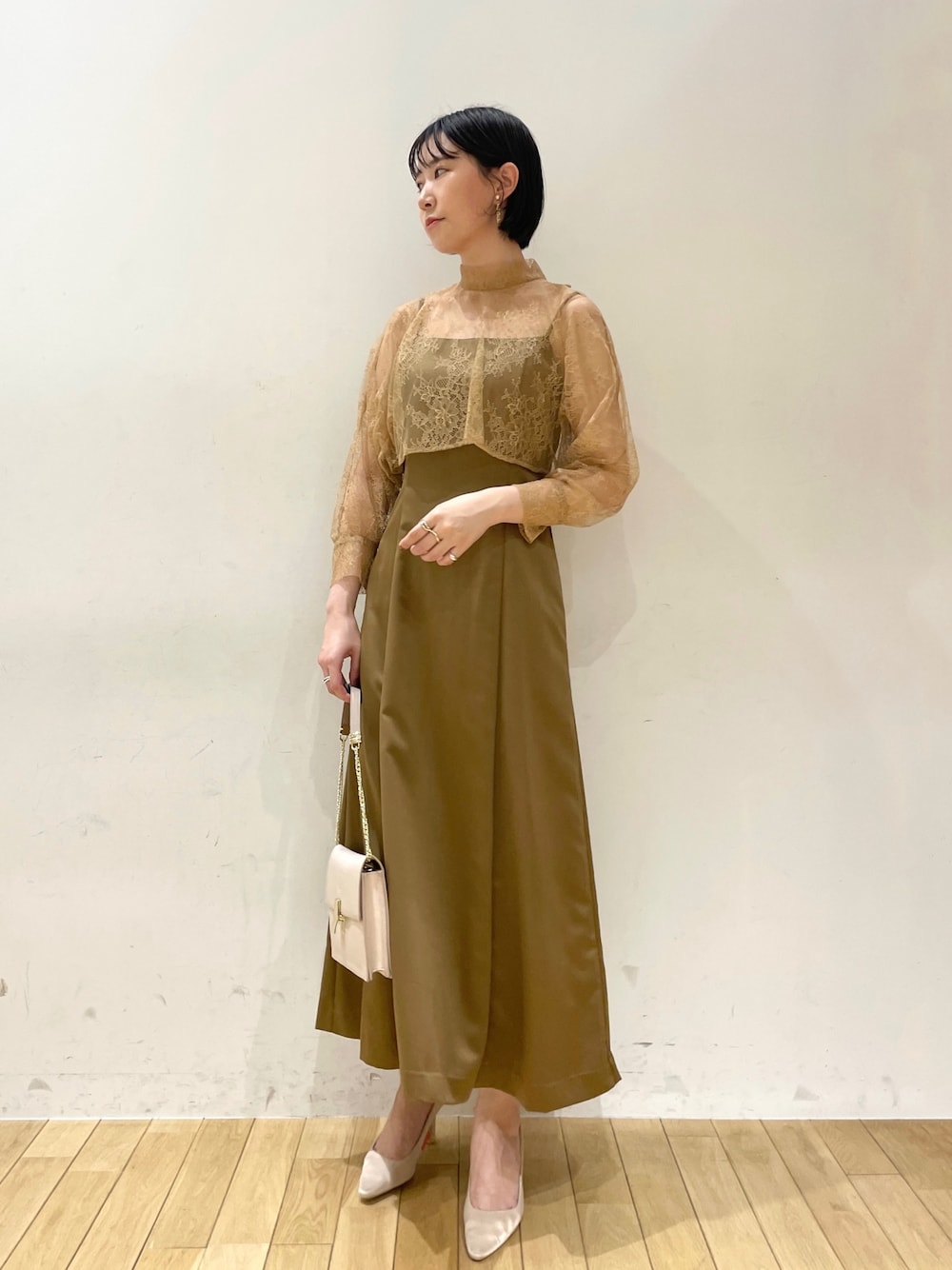 ●落ち着いた色味のお呼ばれコーデ🤎 【dress】サテンのキャミワンピースとショート丈のブラウスがセットになった結婚式にもぴったりのワンピース◎ サテンの艶々とした生地が高級感もたっぷりで重たくなりすぎないです👌🏻 キャミワンピースはウエスト周りがすっきりとしたフレアーシルエットなので、かなりスタイルアップするデザイン↓ 168cm / Mで足首下のロング丈