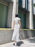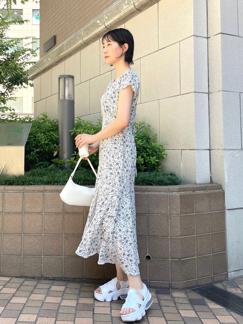 ●夏のイベントにおすすめなワンピ🌿 【Dress】高めの位置のウエストリボンでスタイルアップの叶うワンピース ◯ フェミニンな印象の小花柄でもモノトーンなので、大人っぽくスポーツサンダルで合わせられました🤍 前側が少し短くなっているので脚も細く見える効果有り◎小柄な方も重くなりすぎず着ていただけます!!
