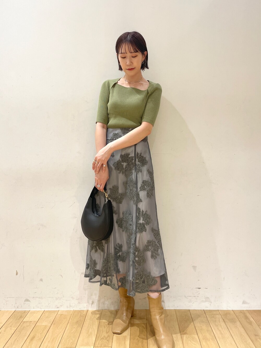●今年も目を惹くGREENコーデ🌿 【Tops】デコルテがアシンメトリーになった大人可愛いニット◯ボトムスにモノトーンやデニムが多い方は今年らしいGREENおすすめ🍃🍃 デコルテ見えするので、ジャケットやGジャンを羽織る秋冬にも活躍しそう👏🏻 【Skirt】チュール地に刺繍が施された特別感たっぷりのスカート😌 トップス次第でドレッシーにも着こなしていただけるのでお食事や特別なご予定にもおすすめです!! 私は日常イメージでショートブーツとニットで着てみました✌🏻 腰回りがタイトなシルエットなので168cmで着丈長めのMサイズで骨盤もぴったりでした!(Sサイズはもう少し短めです)
