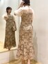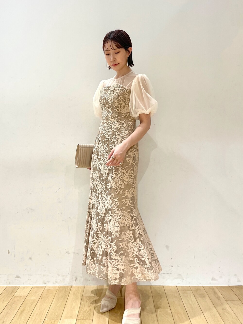 ●特別感たっぷりのお呼ばれDRESS🌿 【Dress】立体的なレースのデザインが体型カバーしてくれて大人可愛い😌🫶🏻 MサイズはSサイズより(総丈+3cm)ウエスト位置は高いのでMサイズでも着膨れしません!(168cm/Sは個人的には骨盤部分が結構タイトでした。。丈長めが好きなのでMサイズは楽に着れた) ウエストに切替がないので嫌な締め付け感はゼロ!膝下からフレアーになっているのでとっても歩きやすいです🩰