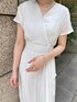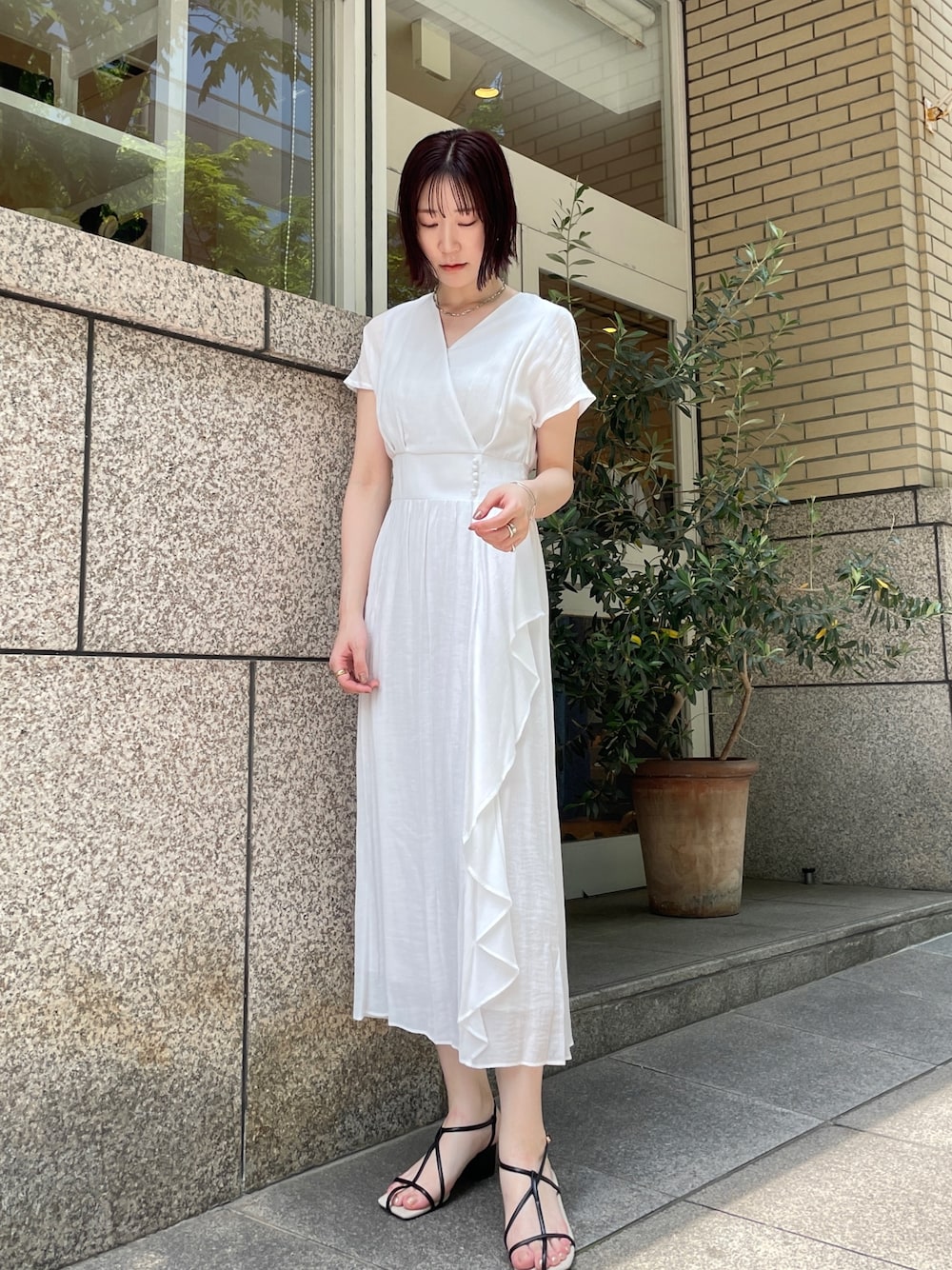 ●キレイめ楊柳ワンピ🤍 【Dress】リラックス感のある楊柳の素材感とカシュクールデザインで女性らしく品のあるワンピース◯ 168cm/ Mサイズで足首が見える着丈なので高身長さんにはMサイズがおすすめ👌🏻(Sサイズは通常丈なので小柄な方にもスニーカーでキレイに着ていただけます!) サラッとした素材なので薄手のジャケットも型崩れなく羽織っていただけます♡ 秋には足元をブーツやローファーに変えてGジャンやライダースを着ても◎