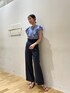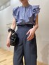 ●再入荷ブラウス 🩵🩵 【Tops】ノーカラーで程よく抜け感があるのでカジュアルが好きな方にも◎ フリルが二の腕をほとんど隠してくれ小顔効果もあります👌🏻 カーディガンやジャケットを羽織っても素敵なのでオフィスカジュアルにもおすすめです🌿 【Pants】さらっとした素材で通気性抜群のパンツなので、蒸し暑い時期にもぴったり✔️ ハイウエストでウエストがVになっているのでお腹もすっきり細見えします!! 168cm/ Sサイズ足首が見える着丈なので高身長さんには丈長めのMサイズがおすすめです!!(Sサイズは通常丈)
