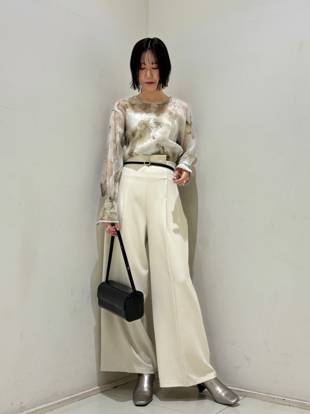 ●まだまだ暑さが残る時に着たいブラウスコーデ🍂 【Tops】ニュアンス柄で甘くなりすぎず大人の方にもおすすめのブラウス。 少し透け感のあるシアーブラウスなので季節の変わり目にもおすすめです♡ (同色のインナー付きです) 【Pants】ウエストのアシンメトリーデザインとバイカラーのベルトが上品で大人な美シルエットパンツ。 168cm→Mサイズが着丈長めなので踵上の長さですっきりと着れました。高身長さんにはMサイズがおすすめです😌 (Sサイズは通常丈です)