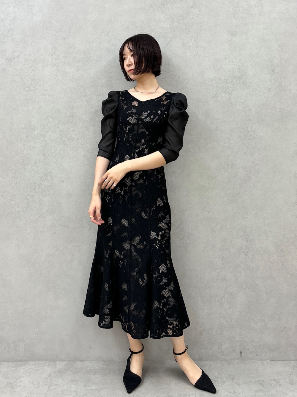 【Dress】結婚式や同窓会におすすめの高級感のある立体的レースドレス✨ 特にブラックは裏地がグレーになっているのでより大人可愛い🖤 普段Mサイズを着るのでSサイズだとふくらはぎ下くらいの着丈です!高身長さんにはMサイズがおすすめ✔️ ウエストに切替がないので締め付け感なく膝下からフレアになっているのでとっても歩きやすいです🩰