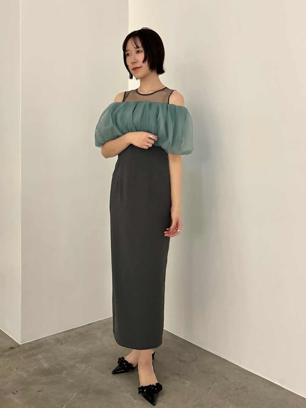 【Dress】お呼ばれにおすすめのオケージョンドレス🌿 168cm / Sで足首が見える着丈です。タイトなシルエットですが腰回りはゆったりとしているのでかなり楽に着れました! チュールのトップスは取り外しでき着回し力抜群なところも魅力的♡ オフショルにするのが二の腕も隠れておすすめです! 胸元パット付きなのでワンピース単体でも綺麗に着用できジャケットを羽織るとフォーマルなシーンにも活躍します◎