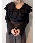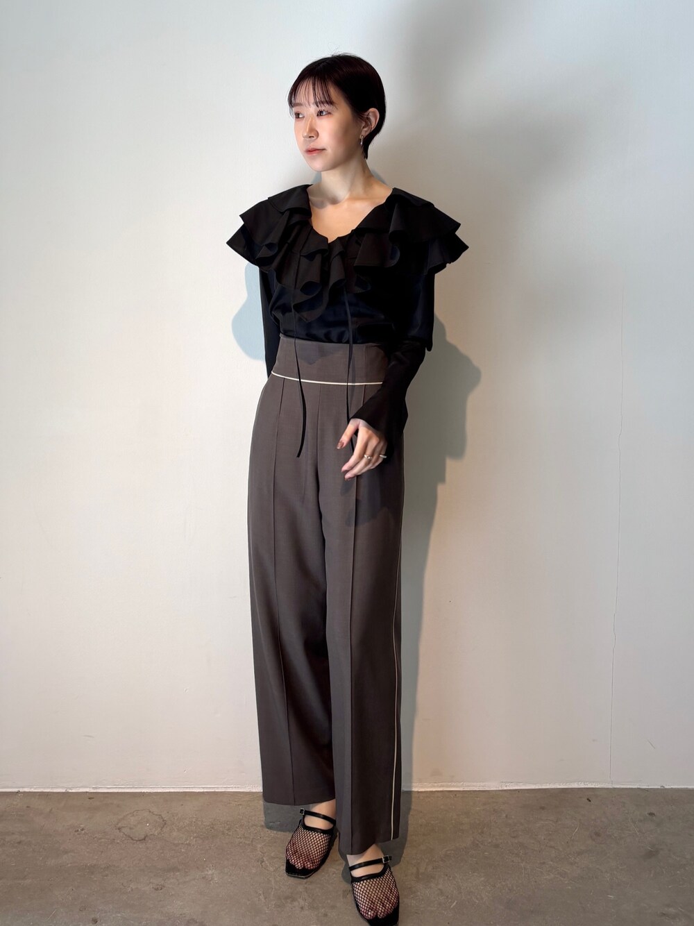 【Tops】小顔効果抜群のフリルブラウス ♥ Vネックなのでブラウスのボリューム感に対して顔周りはスッキリと着れます 🍃 カーディガンやジャケットを羽織っても素敵◯ 【Pants】ハイウエストで脚長効果抜群! チャコールグレーは茶色に近い色味で大人っぽく着れる推しカラー🤎 ジャケットとセット着用可能◎ 168cm→Sサイズで足首下の着丈です。骨盤で止まるので高身長さんは着丈長めのMサイズががおすすめです!