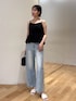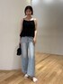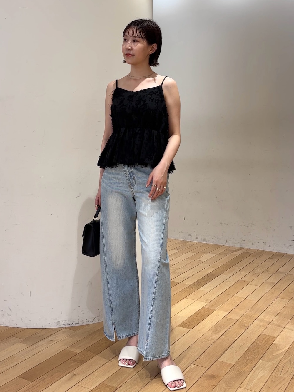【Tops】夏にぴったりのキャミトップス🖤 遊び心のあるカットジャガードでスカートと合わせるとワンピースみたいになります✨ インナーにノースリーブニットやTシャツを合わせても◯ 【Pants】 ウエストがアシンメトリーになったデザインデニム🌿 168cm→Sサイズは足首が隠れる着丈でウエストはぴったりすぎず楽な着心地!