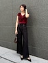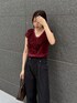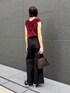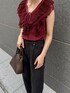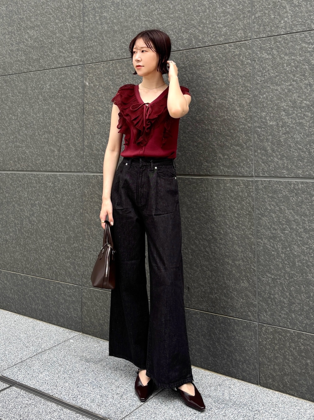 【Tops】レトロ感のあるフリルトップス 🪡 二の腕も出過ぎないなので1枚でも安心して着れた!! 肌馴染みの良いボルドーなので普段赤を着ない方でも挑戦しやすい🤍 【Pants】 スタイル盛れるデニム新登場🖤 タックが入っているので腰回りすっきり細見えした感動デニム !! 168cm→Mサイズでウエストはニットインするゆとり有り◎着丈は足の甲にかかるくらいなので高身長さんにはMがおすすめ!!