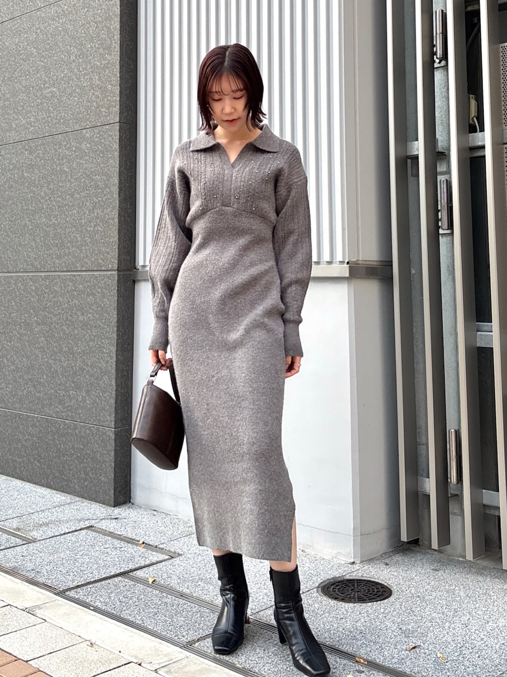【Dress】さりげないビジューが大人可愛いニットワンピース🤍 ウエスト位置が高くタイトなシルエットなので細見え効果抜群◎ チクチクしないニット素材で二の腕もぴったりしないです! サイズ感→Mは着丈が長めで足首下なので高身長さんにはMをおすすめします✔️