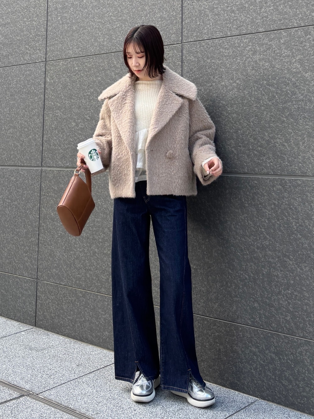 【Outer】軽くて可愛いシャギーコート🍂 裏地付きなので風を通さず暖かく着れます!! ショート丈なのでスタイルアップ効果抜群 ◎ 【Pants】 ウエストがアシンメトリーになったデザインデニム🌿 168cm→Sサイズは足首が隠れる着丈でウエストはぴったりすぎず楽な着心地!! 着丈長めが好きな方はMがおすすめ!!