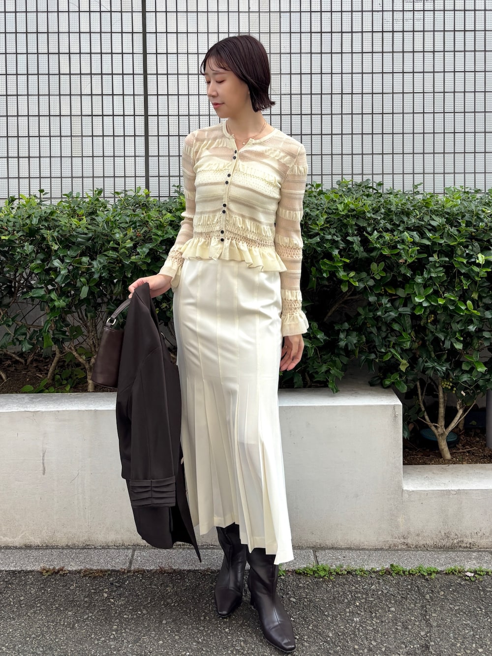 【Tops】大人可愛いシアートップス🤍 出しても着痩せして見えるのでインが苦手な方にもおすすめ!! 【Skirt】春に着たいプリーツスカート🍃 サイズ感→168cm / Sサイズで着丈は足首下ですが腰周りはややタイトめでした!
