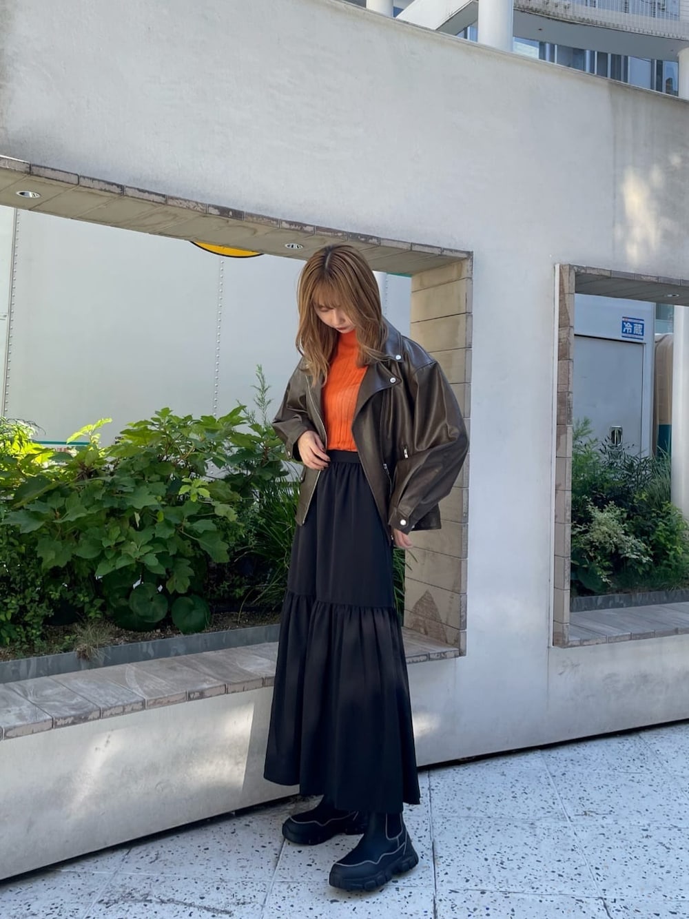 秋の甘辛MIXコーデ♡【アウター】ライダースって重たいイメージありませんか?ムルーアのは生地がしっかりしていて軽い!定番のライダースジャケットですがムルーアならではのカラーが可愛いんです◎今回はブラウンを着てみました!程よいオーバーサイズなのでさり気なく腰周りカバーしてくれる万能アイテム♪【トップス】店舗でも大人気のシアートップス!これさえあればインナーは困りません×もちろんメインでキャミと合わせて1枚で着ても可愛い◎私的おすすめカラーはコーデの差し色になるオレンジです!【スカート】今季トレンドのギャザースカート、ムルーアのはマキシ丈で長めにゆったり着れます♡どんなトップスにも合わせられる万能アイテム!歩いたり風に吹かれると揺れ感がとっても可愛いんです!170cmの私が着てみて足首あたりの丈でした♪