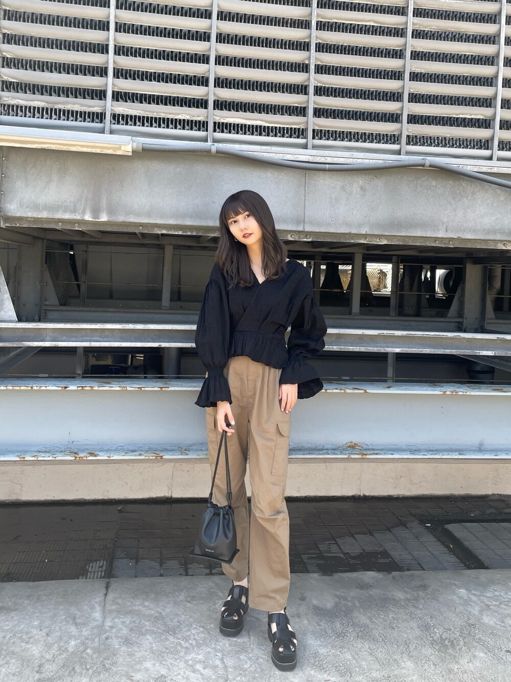 《tops》ポコポコとした素材のカシュクールブラウス♡襟元は開きすぎないのでご安心を♪袖口のゴムギャザーがポイント!コンパクトな着丈なのでハイウエストボトムとの相性◎《pants》カジュアル好きさん必見!美脚ラインのカーゴパンツ♪ショート丈のトップスと相性抜群◎170cmの私がMサイズ着用でくるぶしあたりの丈でした!《shoes》トレンドのクロスストラップサンダル♡ソールにボリュームを持たせてムルーアらしいデザイン◎ソックスなどと合わせたコーデもオススメ♪普段24.5を履いてる私は37(24.5)のサイズでぴったりでした!《bag》コロンとした丸みのあるフォルムでどんなコーデにも馴染む万能バッグ♪トレンドの巾着バッグにスクエアマチでモード感UP!柔らかい素材で中も沢山入りますよ♪