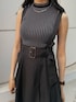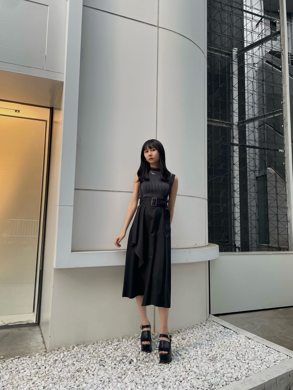 《tops》ストライプ柄がアクセントのニットタンク♡ちょうど下着が見えないアームホールなので1枚でも着やすいです♪もちろんインナー使いとしても◎《skirt》MURUAらしい甘すぎないジャンスカ♡ 肩紐の取り外しができ、ウエストマークできるワイドベルトデザインとムルーアらしい甘すぎないアシンメトリーなタック&フリルデザインがポイント♪170cmの私がSサイズ着用でふくらはぎあたりの丈でした!《shoes》ムルーアらしいブロッキングデザインが目を惹くボリュームサンダル♡ウェッジソール×ストラップが履き心地抜群◎普段24.5を履いているのですが37のサイズでちょうど良かったです♪