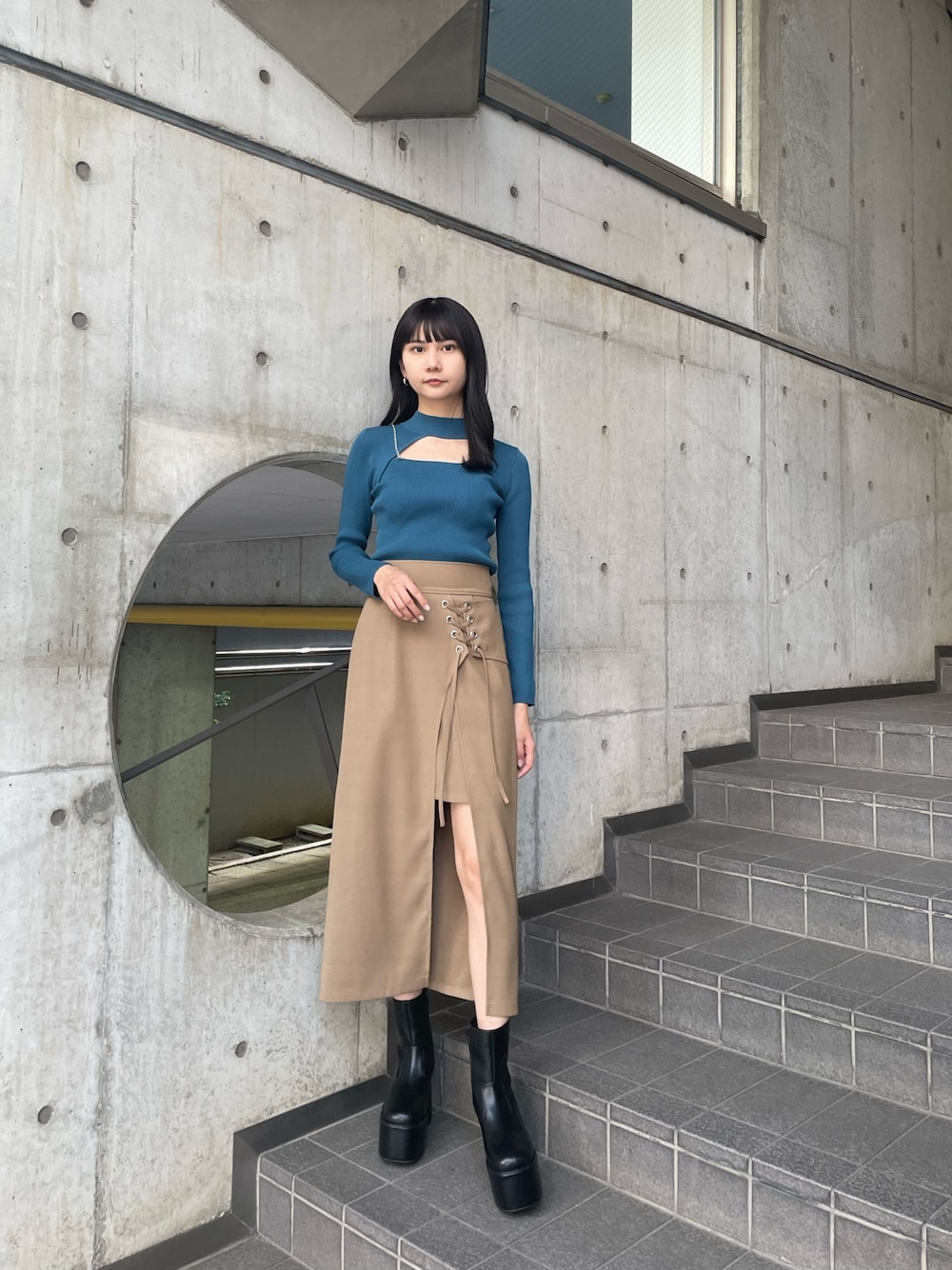 《tops》ショルダーのチェーンデザインがアクセントのニットトップス♡程よい肌みせが顔回りをすっきり見せて抜け感を演出♪タイトなシルエットなのでペンシルスカートで合わせたスタイリングがMURUAらしいコーデでオススメです!(※チェーンは取り外し可能)《skirt》ラップデザインとレースアップディテールがポイントのIラインスカート♡中にミニスカートがついてるのでミニ丈が苦手な方にもオススメ!適度な肌見せで女性らしさUP♪170cmの私がSサイズ着用でふくらはぎ下あたりの丈でした!《shoes》しっかりと高さのあるヒールが、足先まですらっと見せてくれる一足♡プラットフォームデザインなので歩きやすく、安定感◎