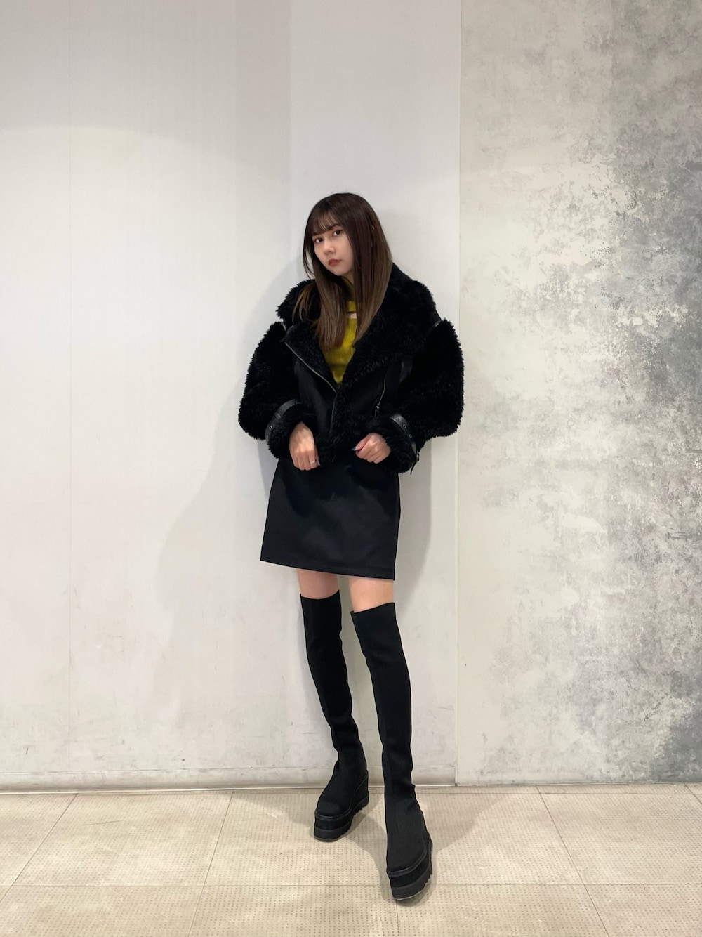《outer》ボリュームのある袖がポイントのショート丈ムートン♪毛足のあるボアで女性らしさ◎どんなコーデにも合わせやすいブラックは3色の中で1番細見えもします! 首元も立てていただくとマフラーいらずで着れます♡ 《skirt》タイトすぎない台形シルエットのミニスカート♡ウエスト部分がカーブしており腰高効果&脚長効果◎170cmの私がSサイズ着用で太ももあたりの丈でした!《shoes》今年もトレンドのニーハイソックスブーツ♡ムルーアで大人気のソックスブーツをニーハイまで伸ばしたデザイン!ストレッチの効いたニット部分は厚みがあるので履きやすさ+ホールド感◎普段24.5を履いてるのですが24.5でちょうど良かったです!