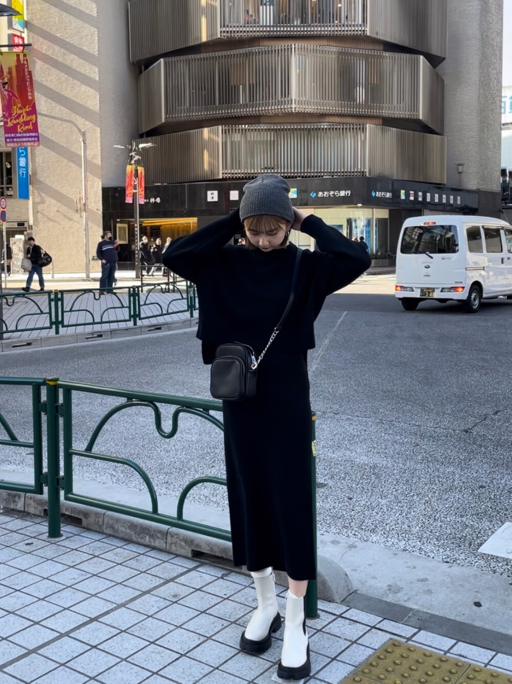 セットアイテム♡《tops》ゆとりのあるシルエットでストレスフリーに着られるニット♩前は絶妙なクロップド丈で後ろはお尻にかかる長さなのでカバーも◎《skirt》ハイウエストで縦ラインが強調される脚長スカート♡伸縮性のある素材でスリットも入っているので歩きやすさも◎170cmの私が着用してみてふくらはぎ下あたりの丈でした!