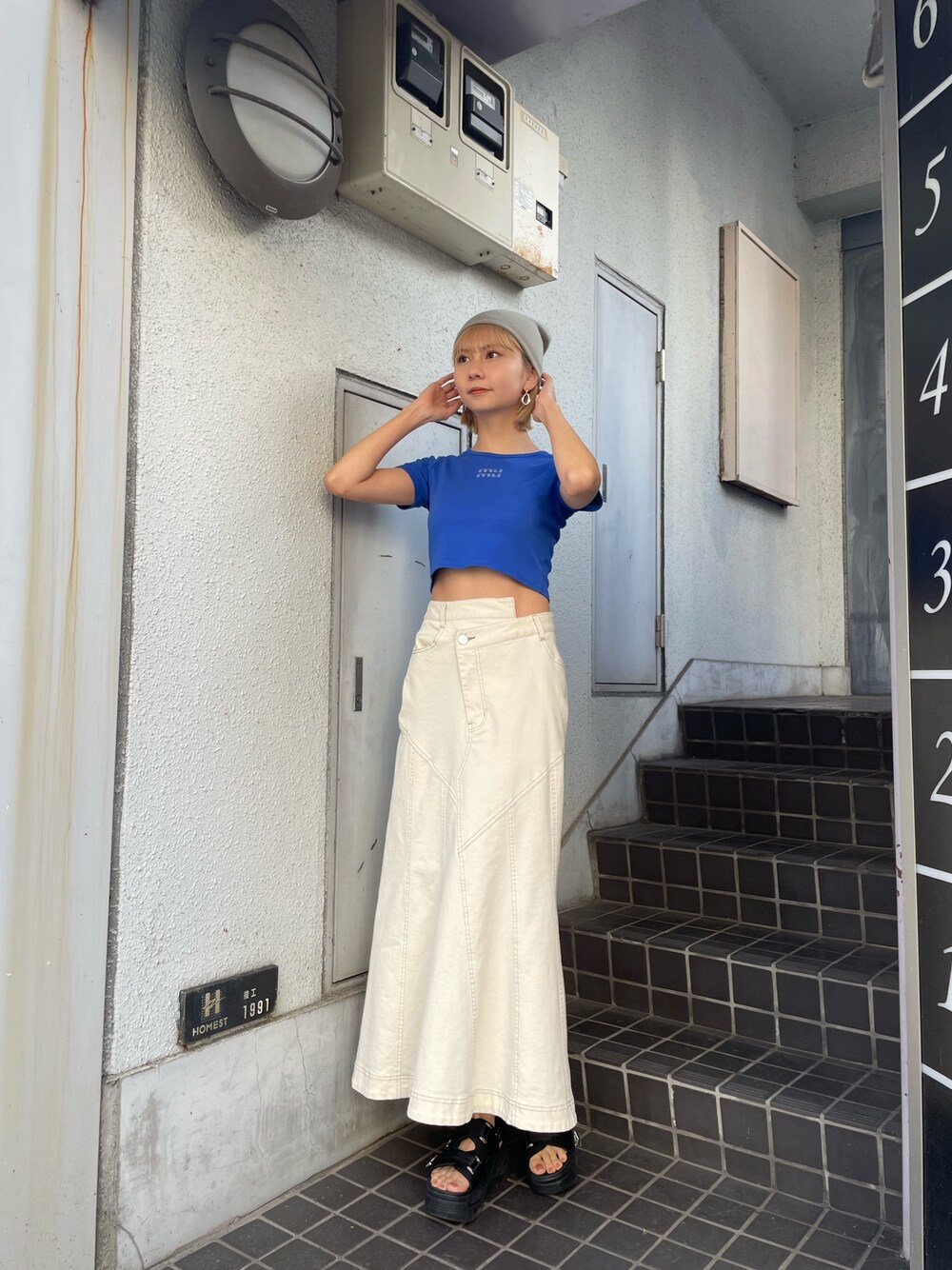 桂束咲(MURUA)のデニムスカート「ウォッシュドデニムマーメイドスカート」を使ったコーディネート