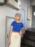 春夏デニムコーデ♡【skirt】ウエストデザインが目を引くデニムスカート。切り替えのデザインもムルーアらしいポイント。170cmの私がSサイズ着用でくるぶしあたりの丈でした。