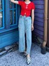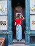 【tops】ホックデザインがポイントのニット。首周りがすっきり空いてるのと、綿タッチの素材なので着心地も◎程よくフィットしてくれ、裾のホックを少し外して着るのもオススメ!【skirt】フロントに大胆なスリットが入ったデニムスカート。程よくタイトなシルエットなので女性らしさ◎170cmの私がMサイズ着用でくるぶしあたりの丈でした!【shoes】ベルトデザインが目を惹くパンプス。ヒールが高くなく歩きやすくデイリー使いも◎普段24.5〜25.0で24.5でぴったりでした!(かかとのベルトも調節ができます)