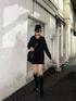 《one-piece》スキッパー襟のミニ丈ニットワンピース。スキッパー襟が程よくデコルテを見せ、顔回りをすっきり見せてくれます◎胸元にシルバーワンポイントが付いていてさりげない可愛いポイントです。《shoes》トレンドのブロケットコアなコーデにぴったりの、フェイクレザーボクシングブーツ。ソールはスニーカーライクなので歩き心地もよく、レースアップで筒幅の調節もでき◎
