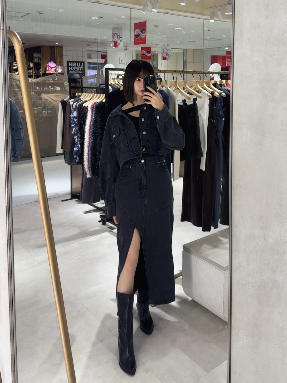 《outer》ムルーアで大人気のデニムセットアップシリーズ。オーバーシルエットですが、クロップド丈でスタイルアップ効果もあり、ボリュームのある袖がトレンディな1着。今の時期から中に着込んで着れます◎《skirt》この夏即完した人気のデザインのロングスカートを来春用にブラッシュアップ。ディープスリットが女性らしいスカートで、170cmの私がMサイズ着用でふくらはぎ下あたりの丈でした!《shoes》トレンド感のあるワイドシャフトのポインテッドブーツ。インソール入りでスタイルアップ効果も抜群◎
