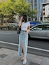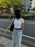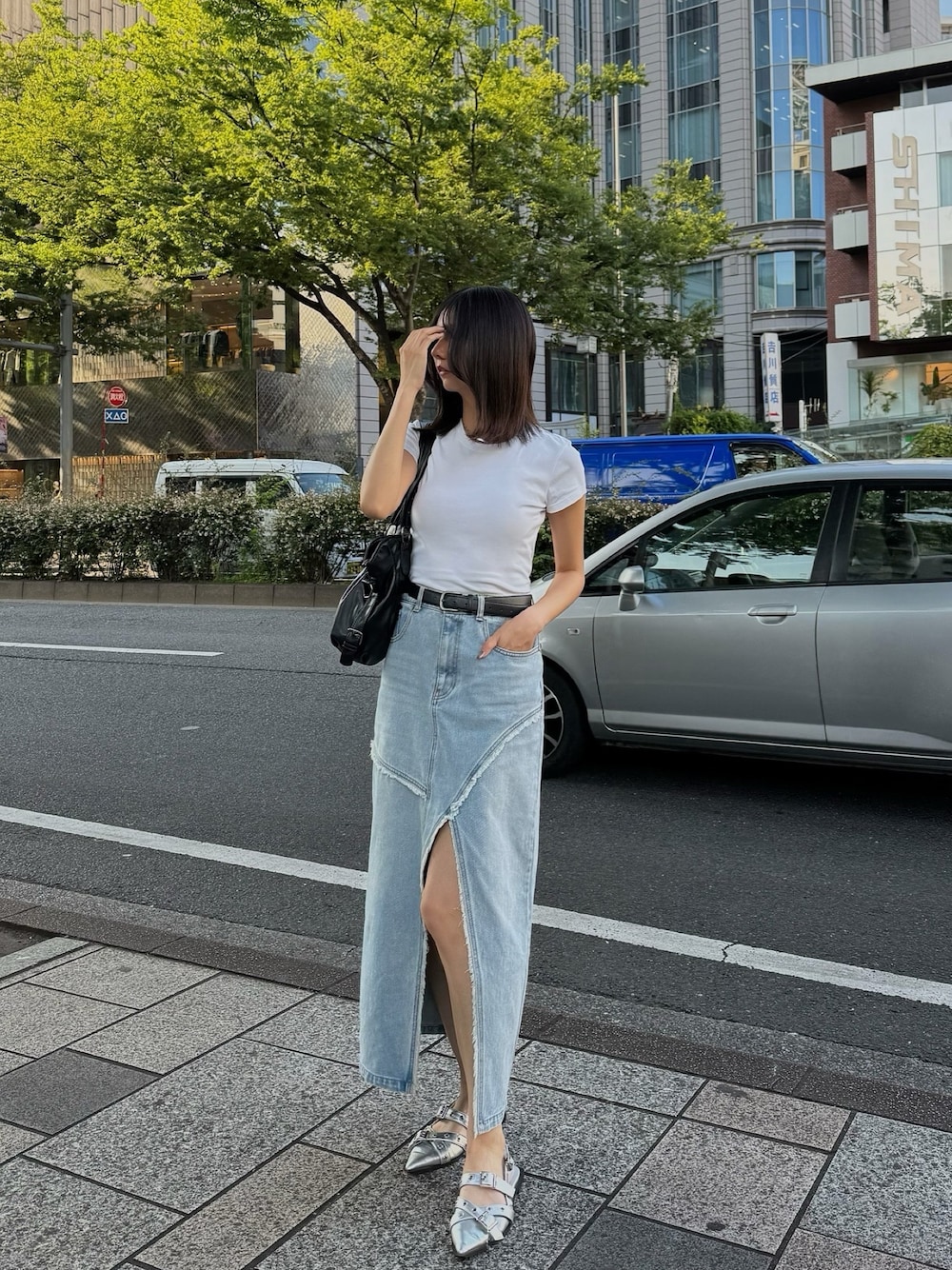 《skirt》フロントに大胆なスリットが入ったデニムスカート。程よくタイトなシルエットなので女性らしさ◎170cmの私がMサイズ着用でくるぶしあたりの丈でした!《shoes》ベルトデザインが目を惹くパンプス。ヒールが高くなく歩きやすくデイリー使いも◎普段24.5〜25.0で24.5でぴったりでした!(かかとのベルトも調節ができます)