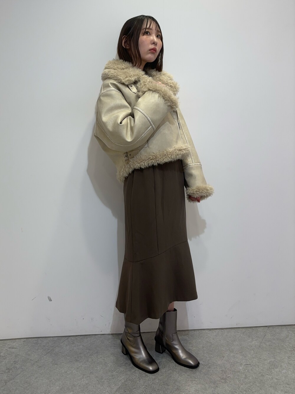 outer→毎年大人気、入荷後即完売のムートンコート⛄️ もっこもこでとっても暖かく風を通しにくい素材な為、寒い冬の強い味方になってくれます!フリーサイズのムートンは袖丈が足りなくなることが多いのですが、しっかり着込めるオーバーサイズになっているのもあり袖丈もしっかり足りました! 今年は5色ありますが柔らかく綺麗な雰囲気で着たかったのでアイボリーにしました🤍 tops→MURUAの秋と言えばこれ!なハーフスリーブニット🖤 今年は少しドライな素材になっているので残暑の厳しい時期でも着れそうです💓とりあえずこれを持っておけばボトムは選ばず使える万能トップスです! skirt→個人的に大好きなマーメイドスカート! いつもMURUAのマーメイドはXSかSをはきます。サイドのベルトでウエストを調節ができるのがありがたいポイントです🫶🏻 165cm、Sサイズ着用で写真のような丈感です。 boots→入荷してきた時から大好きな少しメタリックなブラウンブーツ🤎 トレンド感抜群で履くだけで足元からオシャレ上級者になれます✨ 靴は普段25cm(幅狭め、甲低め)ですが今年もこの形の24.5cmだったら圧迫感なく履くことができました!白、黒のブーツは持ってるという方にぜひオススメしたいカラーです!