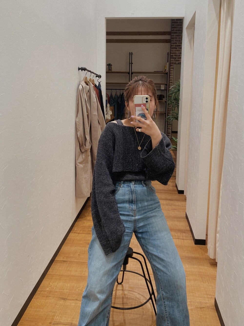 【トップス】 着回し抜群のニット🧶 スクエアネックのノースリーブとショート丈トップスがセットになったアイテム☑︎ ショート丈のトップスはカーデとしても着用可能です🙆🏼♀️インナーは程よくフィットするサイズ感なのでシャツと合わしても使いやすいアイテムです🌿 【パンツ】 Ungrid史上1番柔らかいデニムです👖✨オーガニックコットンで作られていて軽くて柔らかくてとにかく履きやすいです🐋太めのルーズなシルエットで体型も拾わずスッキリで履いて頂けます🧺153cmで24インチを着用しており、ブーツやスニーカーにもたつく長さです!♡長めにずるっと履くのがオススメです〰️☁️