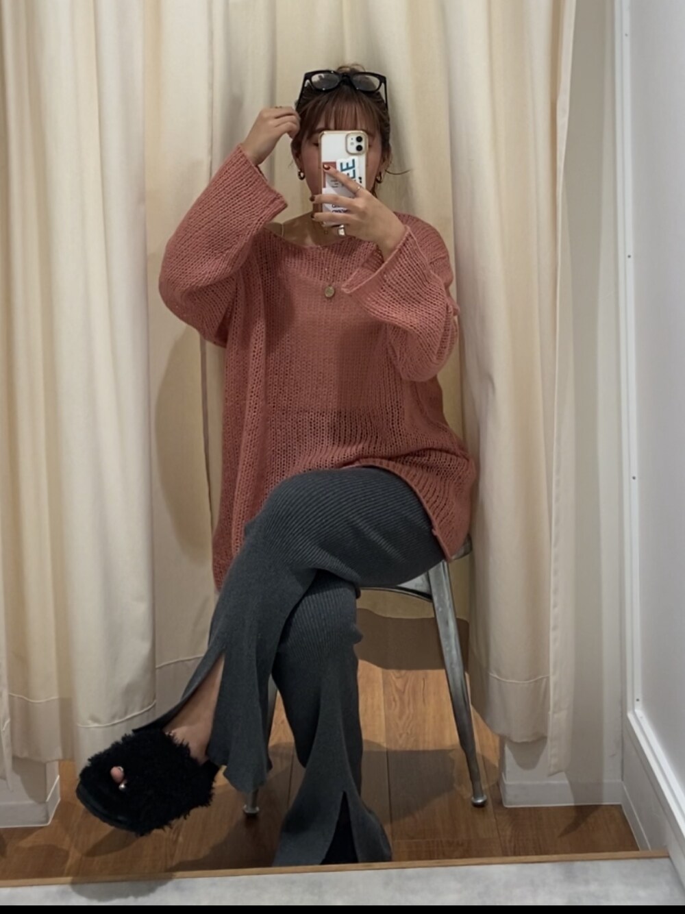 "instagram → 【@natsumi_nakai_】" 透かし編みニットコーデ リール詳細🎞️ 【ニット】 去年も大人気だった透かし編みニット🧶 丈感は153cmで腰回りすっぽり隠れる丈間です☑︎インスタイルやアウトスタイルどちらでもバランス取りやすく、涼しくなればすぐにキャミソールで合わしたり、ロンTやタートルニットレイヤードもできるので着回しも抜群です🙆🏼♀️ 【パンツ】 カジュアル感が可愛いニットフレアパンツ🧶♡脚のラインは程よくフィットするサイズ感で、腰回りが見えても履けるデザインになっております🪞ウエストもゴムなので楽に履いて頂けます🪽 【シューズ】 フェイクファー素材を使用したサンダル🐻🖤 見た目もキャッチーなデザインでコーデのアクセントになります☑︎