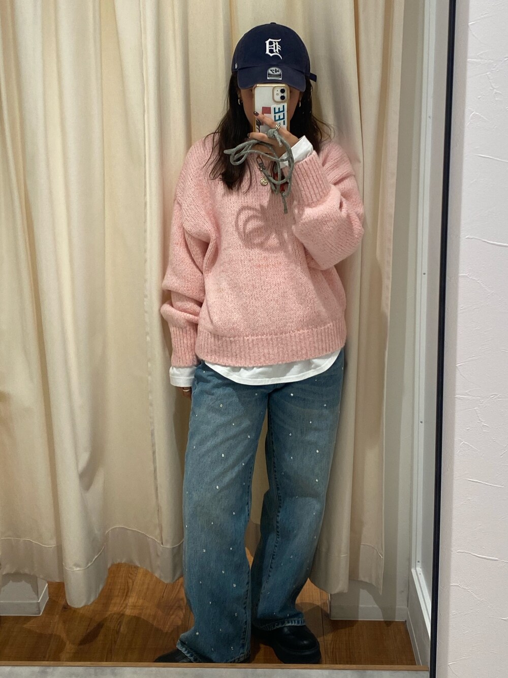【ニット】 今季も大人気のニット🧶✨チクチク感もなく着心地も抜群です☑︎ほどよくルーズなサイジングなのでバランスもとりやすく、ボトムスも選ばず着て頂けます🙆🏼♀️カラバリも豊富なので2色買いされる方も多いニットです🩷✨ 【トップス】 レイヤードに最適な毎年大人気のロンTee🎧 裾がラウンドになってるので、チラッと見えるのがお洒落見えのポイント💡これ1枚あるとスタイリングがランクアップします🤫 【パンツ】 こちらもトレンド感のあるビジューデザインを取り入れたパンツ👖♡1本でおしゃれ見えするデニムです🪽ハイウエストでルーズ感もあり、153cmで24インチ着用し少し底のあるシューズで合わしてもらうと長さも綺麗に履いて頂けます🙆🏼♀️