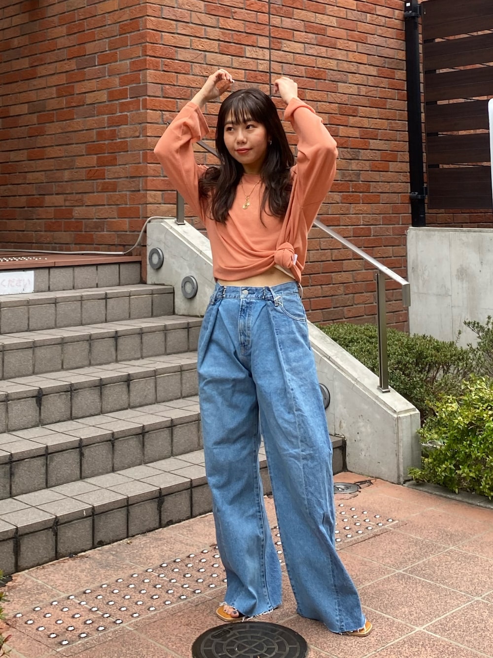 【トップス】 透け感が可愛いトップス🍒なに着たらいいかわかない季節でもさらっと着れるのでおすすめです☑︎ロンTeeやロゴTee、キャミソールとのレイヤードができてインナーで気温感調節して頂けるので夏前まで着用頂けます🙆🏼♀️ 【ボトムス】 デザイン性抜群のデニム👖 ウエストのタックが腰回りすっきり見せてくれます🙆🏼♀️153cmで24インチ着用しており、少しヒールのあるもので合わして頂くと◎これ1本でお洒落見え間違いなしです☑︎