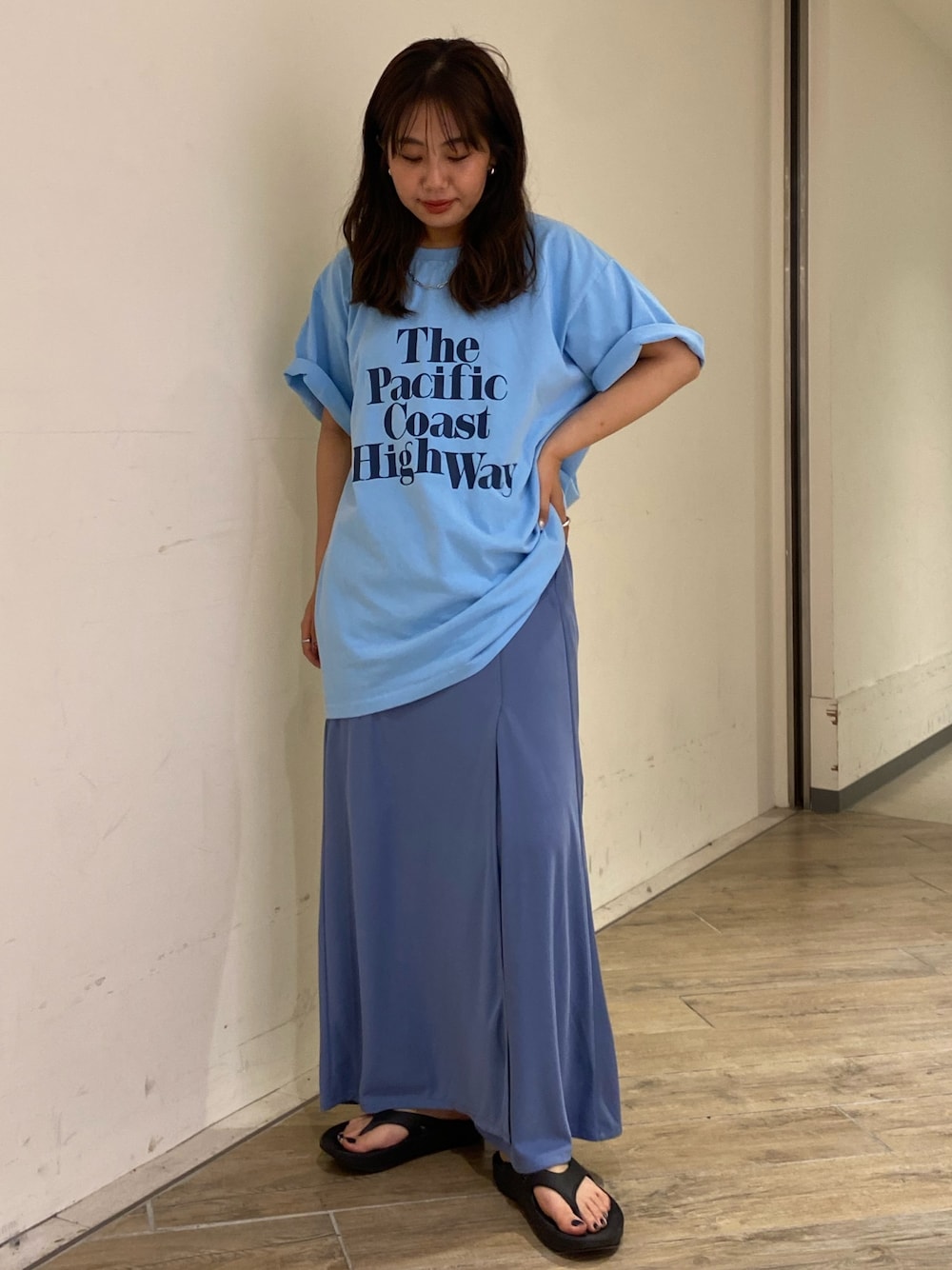 【トップス】 大人気のTeeから新色登場🫐💙 ロゴの配色も可愛く、ワントーンコーデもおすすめです👍🏼💙 長めの丈感で、153cmで腰回り隠れる長さです✔️ 【スカート】 とにかく履きやすいタイトスカート🌼 腰回りをあまり拾わず、伸縮性もあるのでラフに着て頂きやすいです🙆🏼♀️ウエストはゴムになってるので折り返して頂いたり、腰履きもできるので身長問わず履いて頂けます💙