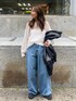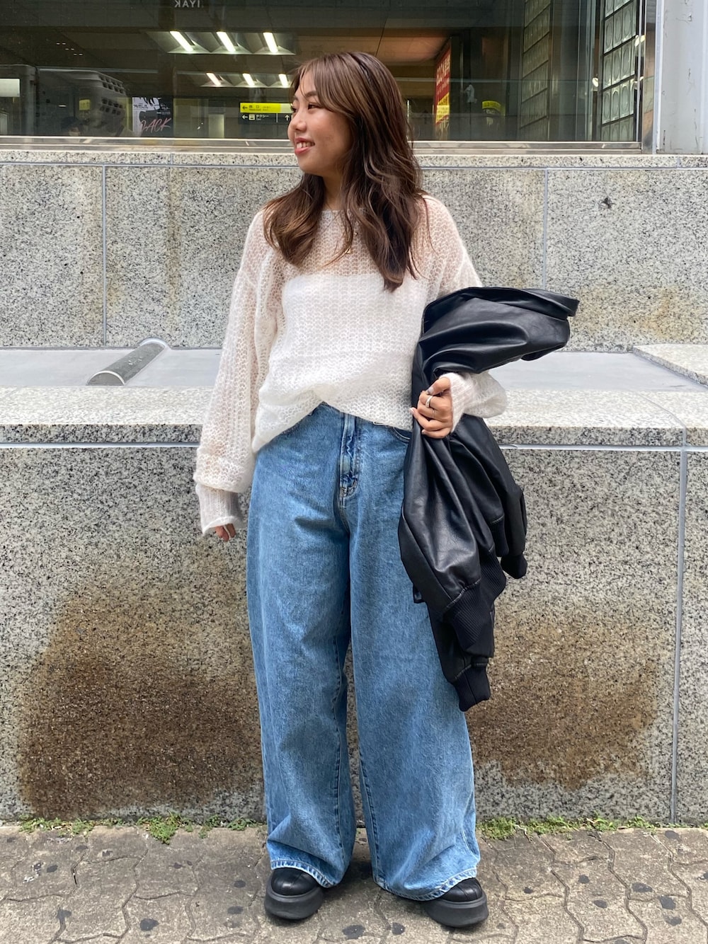 【ニット】 毎年大人気の透かし編みニット🦙 アルパカ混の糸を使用しているので、ふんわりと柔らかい印象に☑︎チクチク感もないので、今の時期からすぐにキャミソールの合わせで着て頂けます🙆🏼♀️ロンTやタートルニットの重ね着もして頂けるので、長い季節感着用頂けます🫰🏻 【パンツ】 153cmで24インチ着用で、厚底のブーツを履いてかかとにかぶるぐらいの丈感です◎ずるっと長さを出して履いて頂くのがおすすめ‼︎ 腰回りも拾わず、スッキリ見えしてくれる、今っぽいシルエットのデニムです👖