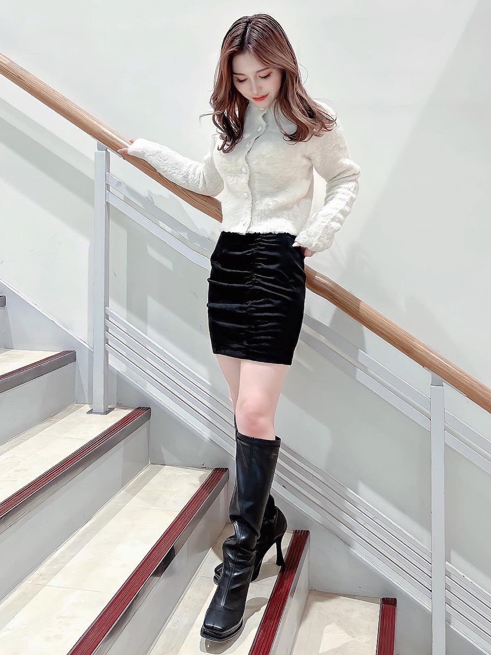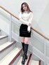 ふわふわのニットとギャザーのミニスカートの女の子らしいコーデを甘くなりすぎないようにモノトーンでまとめました♡ トップスは2wayになっており前後逆でも着用できるので合わせやすいです♪