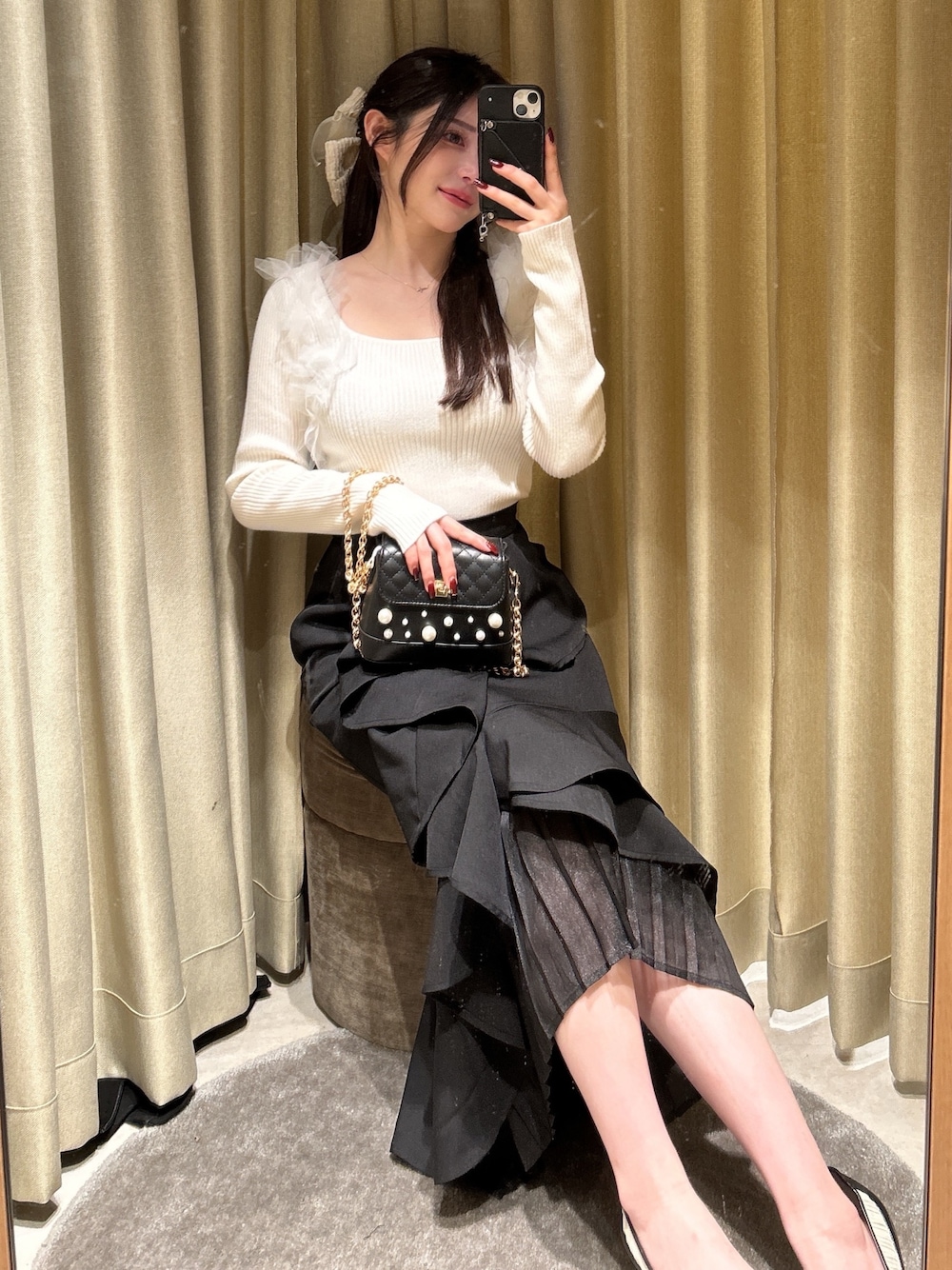 顔周りのフリルが華やかな印象なトップスは1枚で写真映えのアイテム! スカートはタイトながらもフリルでお腹と太ももの張りをカバーしてくれて、お腹いっぱい食べても気にならないです♪